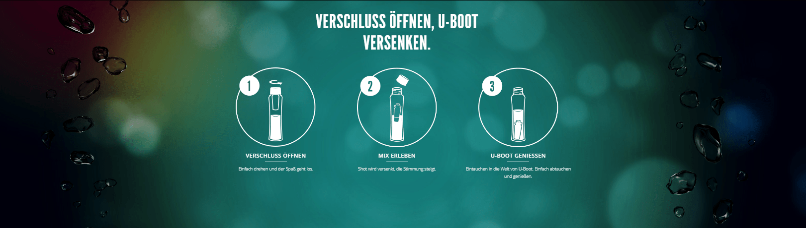 Anders als bei klassischen Fertig-Longdrinks wird das U-Boot erst beim Aufdrehen der Flasche gemixt. Der Shot im Deckel sinkt ins Getränk, verbindet sich mit der Limonade oder dem Energy-Drink und sorgt für ein spektakuläres Trink-Erlebnis. Dieses innovative Szenegetränk verbindet Geschmack, Überraschung und Party-Feeling in einer Flasche.